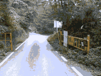 上の写真から分岐した道はまだ県道なのですが,この先の林道の通行止め予告看板があります.