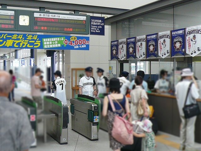 日本ハムのユニフォームを着た駅員さんがお出迎え