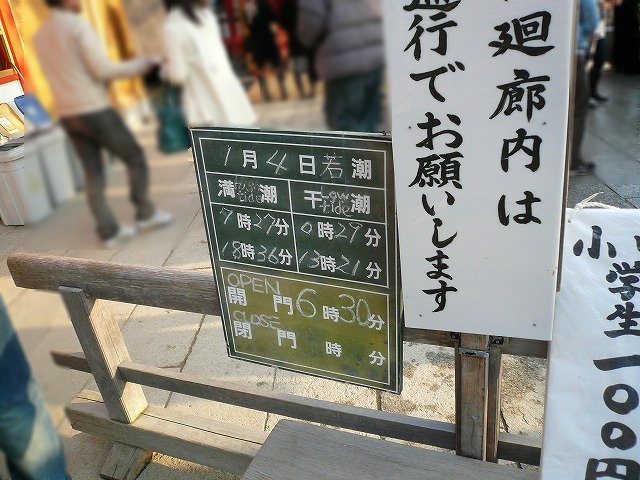 神社の入口には今日の満潮と干潮の時刻が書いてあります